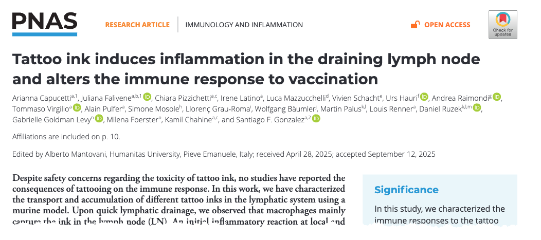 « Malgré les inquiétudes liées à la toxicité des encres de tatouage, aucune étude n'a encore documenté les conséquences du tatouage sur la réponse immunitaire. Dans ce travail, nous avons caractérisé le transport et l'accumulation de différentes encres de tatouage dans le système lymphatique à l'aide d'un modèle murin », écrit la chercheuse Arianna Capucetti dans l'étude.
