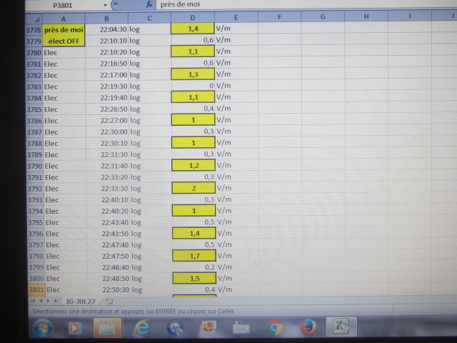 Il en ressort que les valeurs régulières les plus fortes de champs électriques anormaux se trouvent dans « mon » grenier, au niveau du mur qui jouxte un autre grenier que s’est gardé le propriétaire.