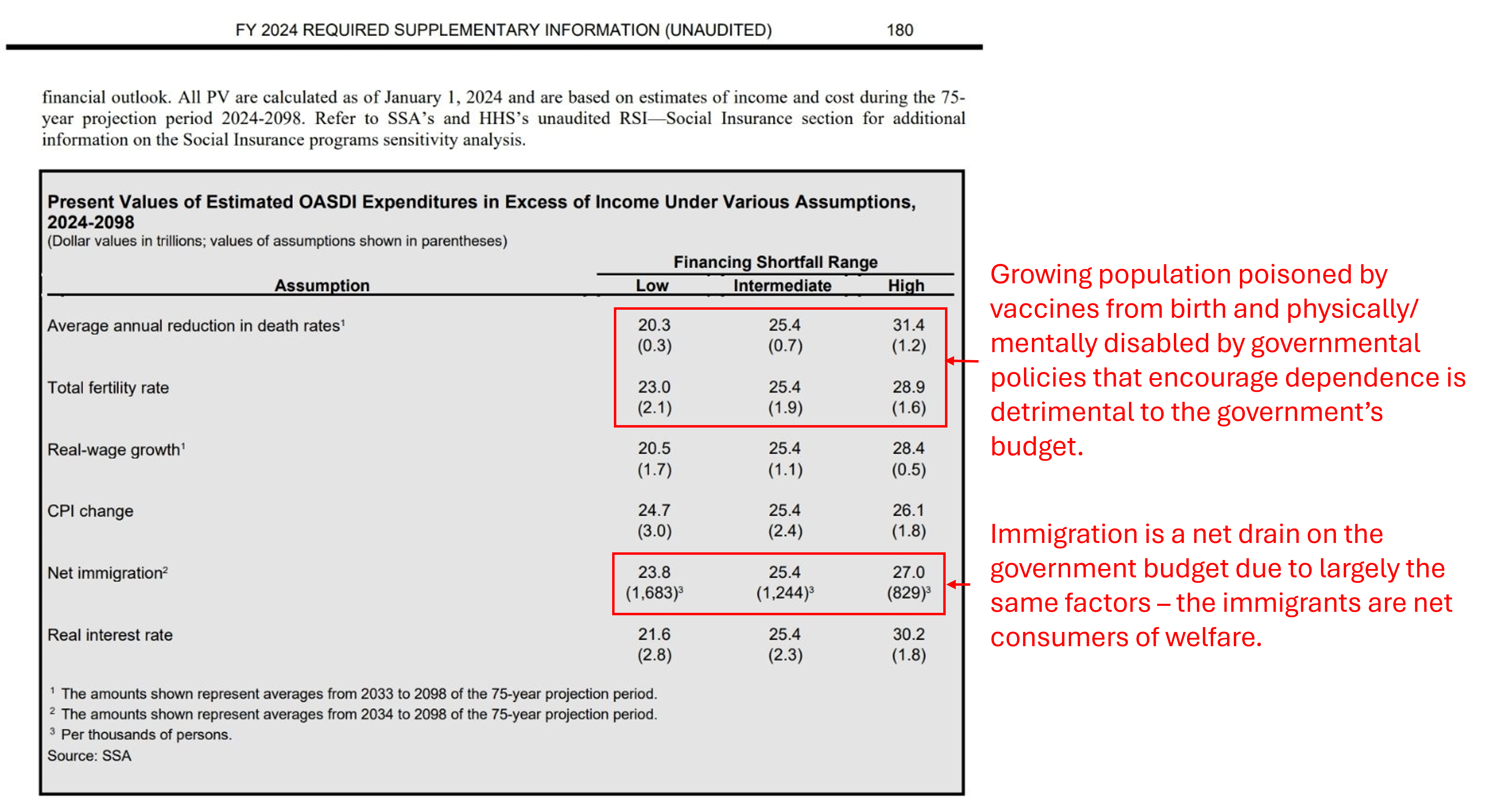 The table above is a so-called financial sensitivity analysis, i.e. running 3 scenarios using ranges for underlying assumptions and looking how these scenarios/assumptions affect the model’s output. The results and associated footnotes seem counter-intuitive: why are they saying that increasing fertility, i.e., in theory, producing more working age adults vs. retirees, is a net drain on Social Security?