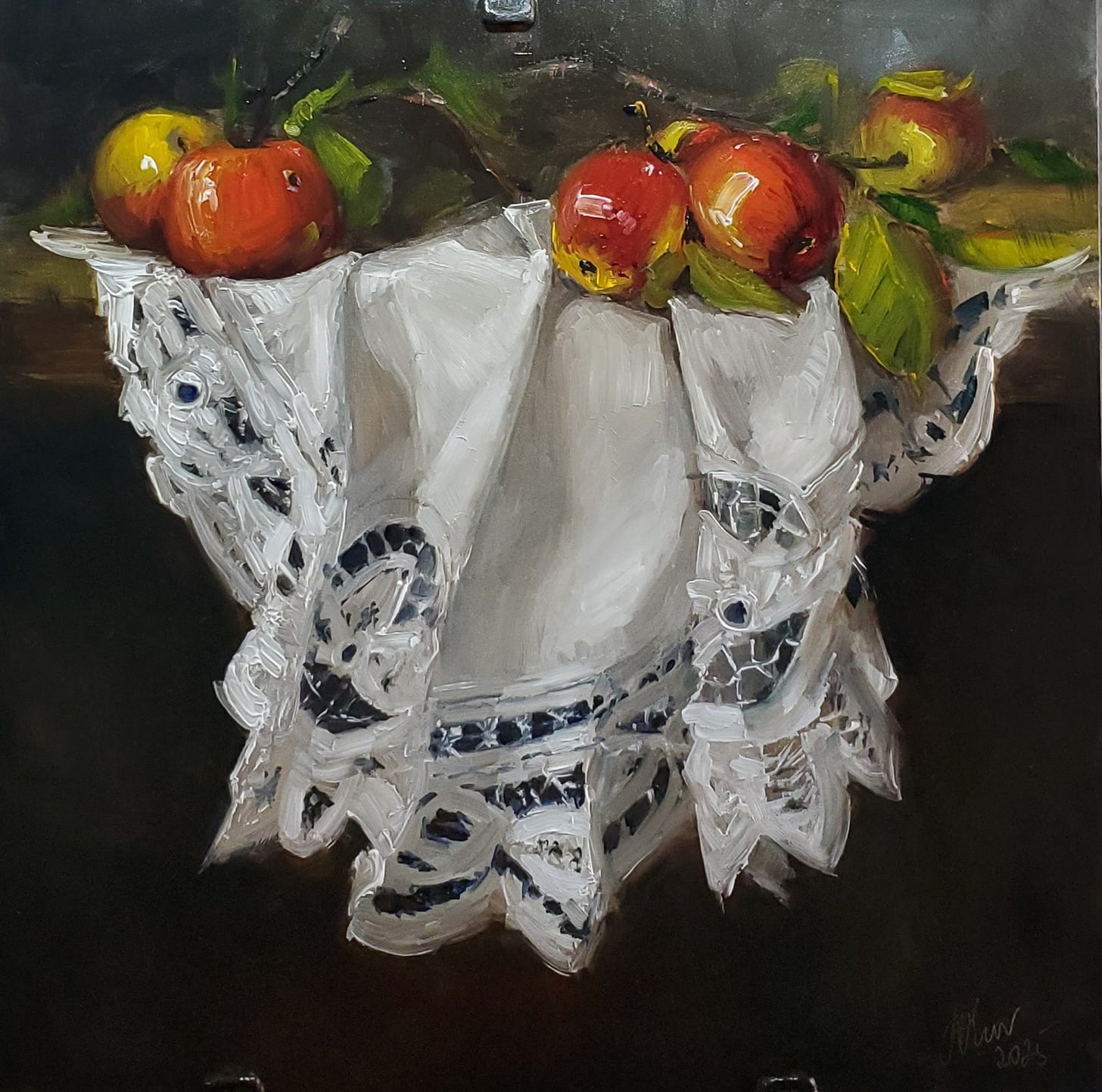 Art for today: Still life with apples, oil on panel, 12x12 in. Other available art here.