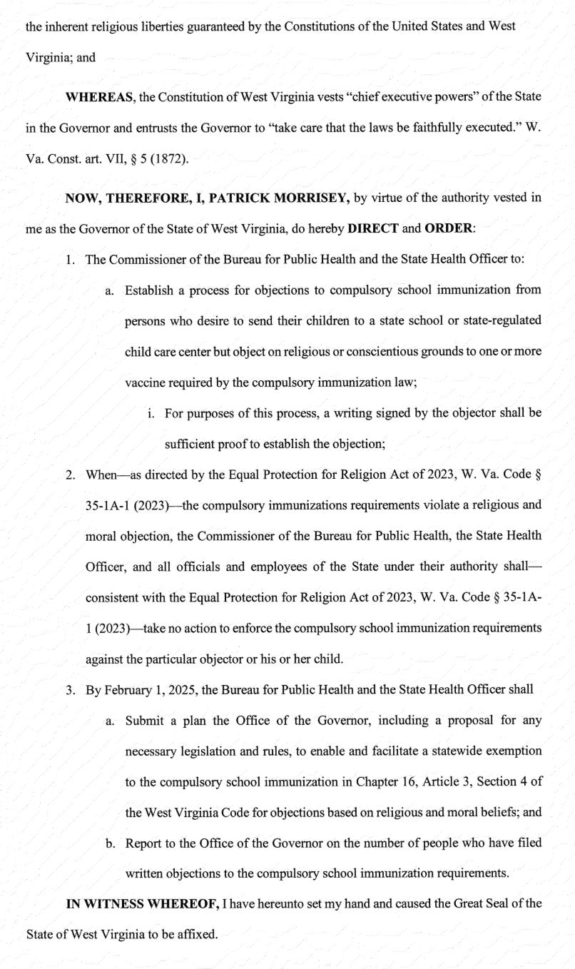 After this article was published, the Governor of West Virginia issued an executive order, directing the health department to establish a process for religious exemption from compulsory vaccination law in WV. This is the post from RFK Jr/HHS Secretary account on X with EO linked in it: