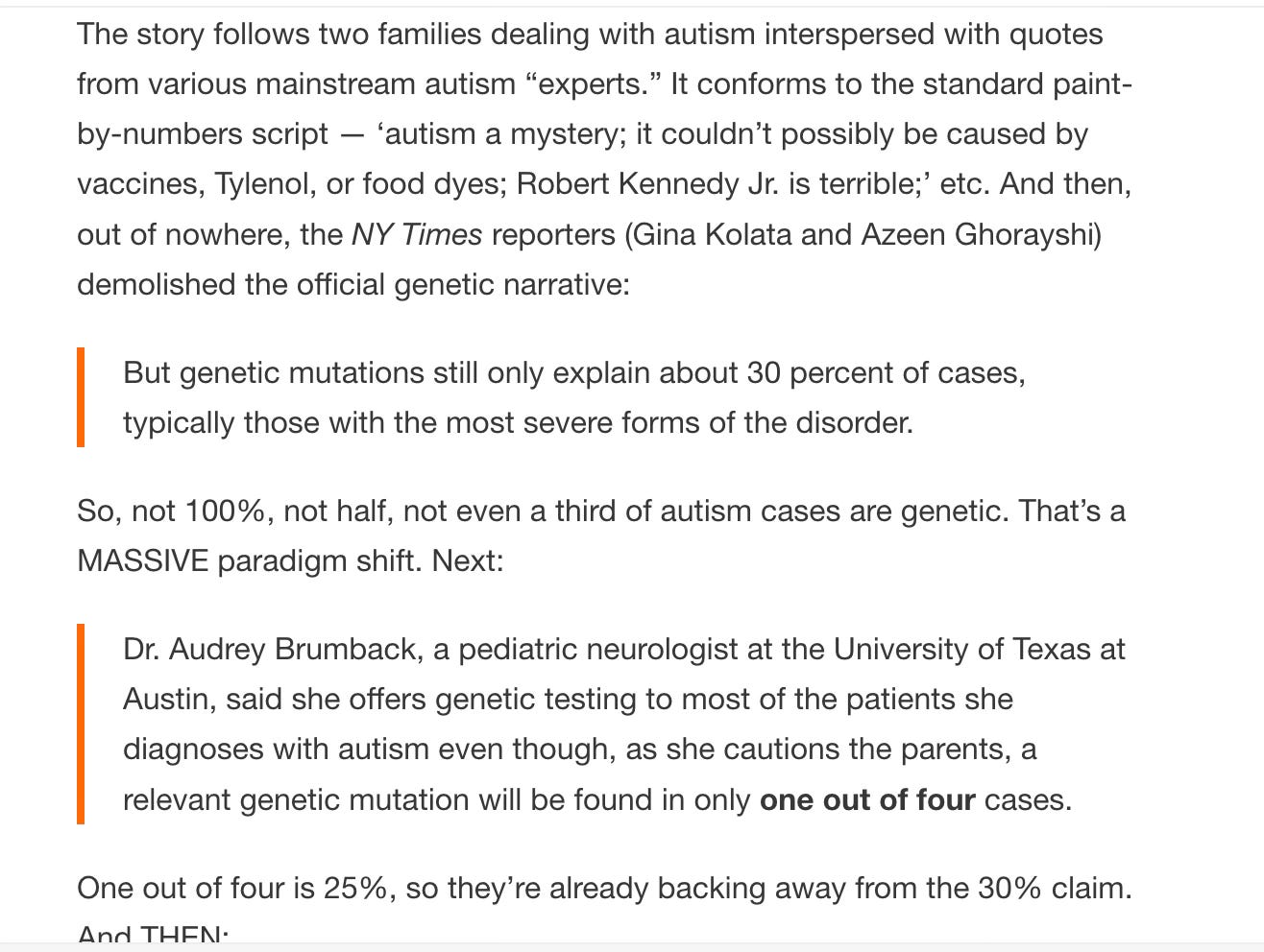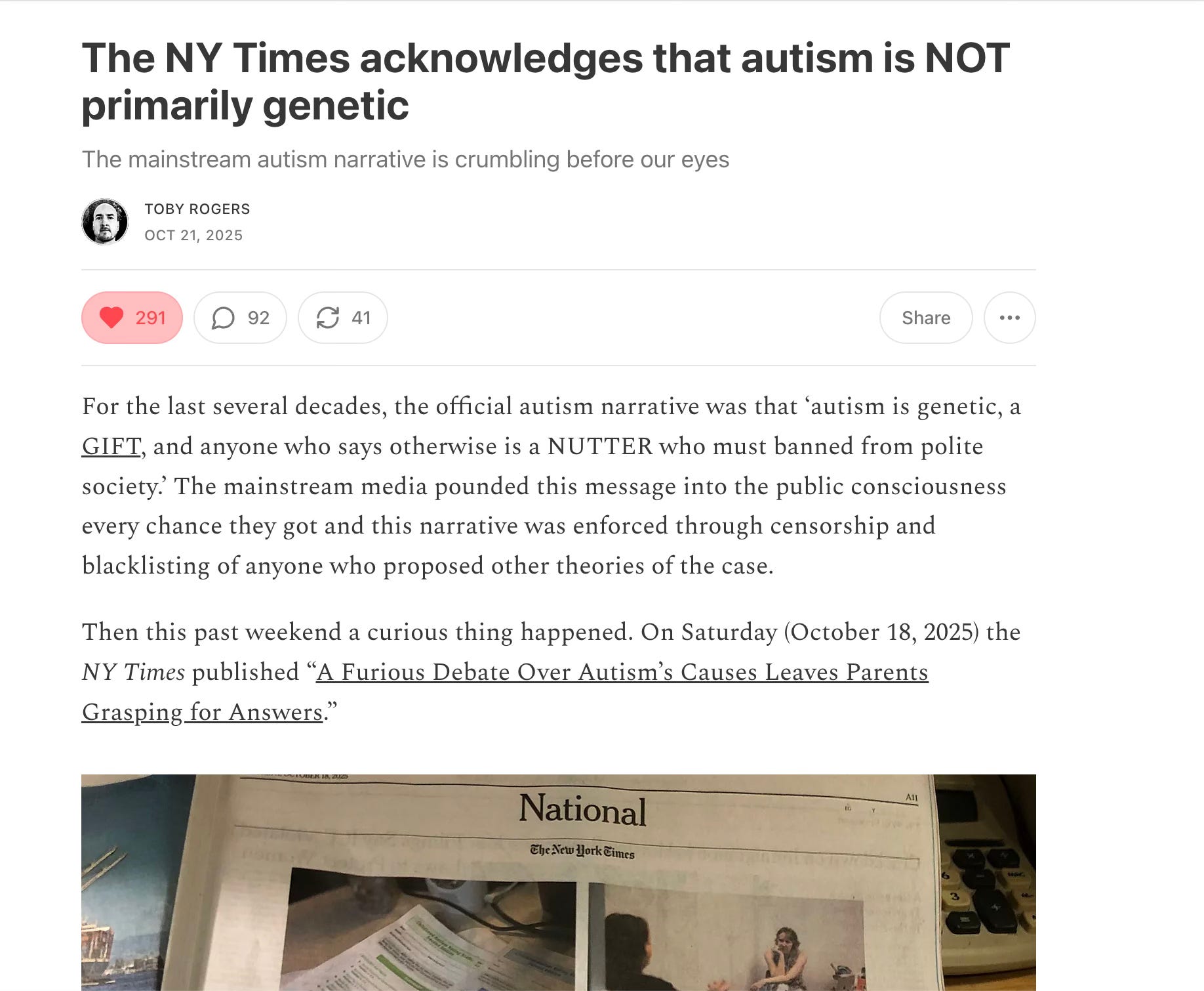 Gina Kolata, du New York Times, admet que l'autisme n'est pas génétique : « Le génie est sorti de la bouteille », écrit le Dr Toby Rogers.