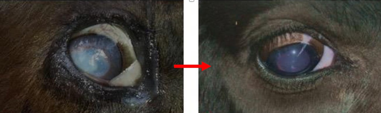 J'ai également reçu de nombreux rapports remarquables d'animaux de compagnie dont les yeux étaient blessés et qui auraient normalement été retirés au lieu de se rétablir complètement :