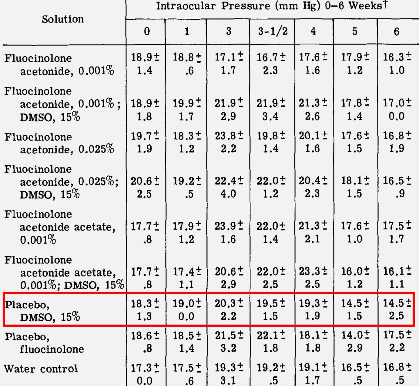 À son tour, la seule étude que je connaisse qui a directement évalué les effets du DMSO sur la PIO (qui a été réalisée sur des lapins) a révélé qu'au fil du temps, le DMSO la réduisait efficacement :