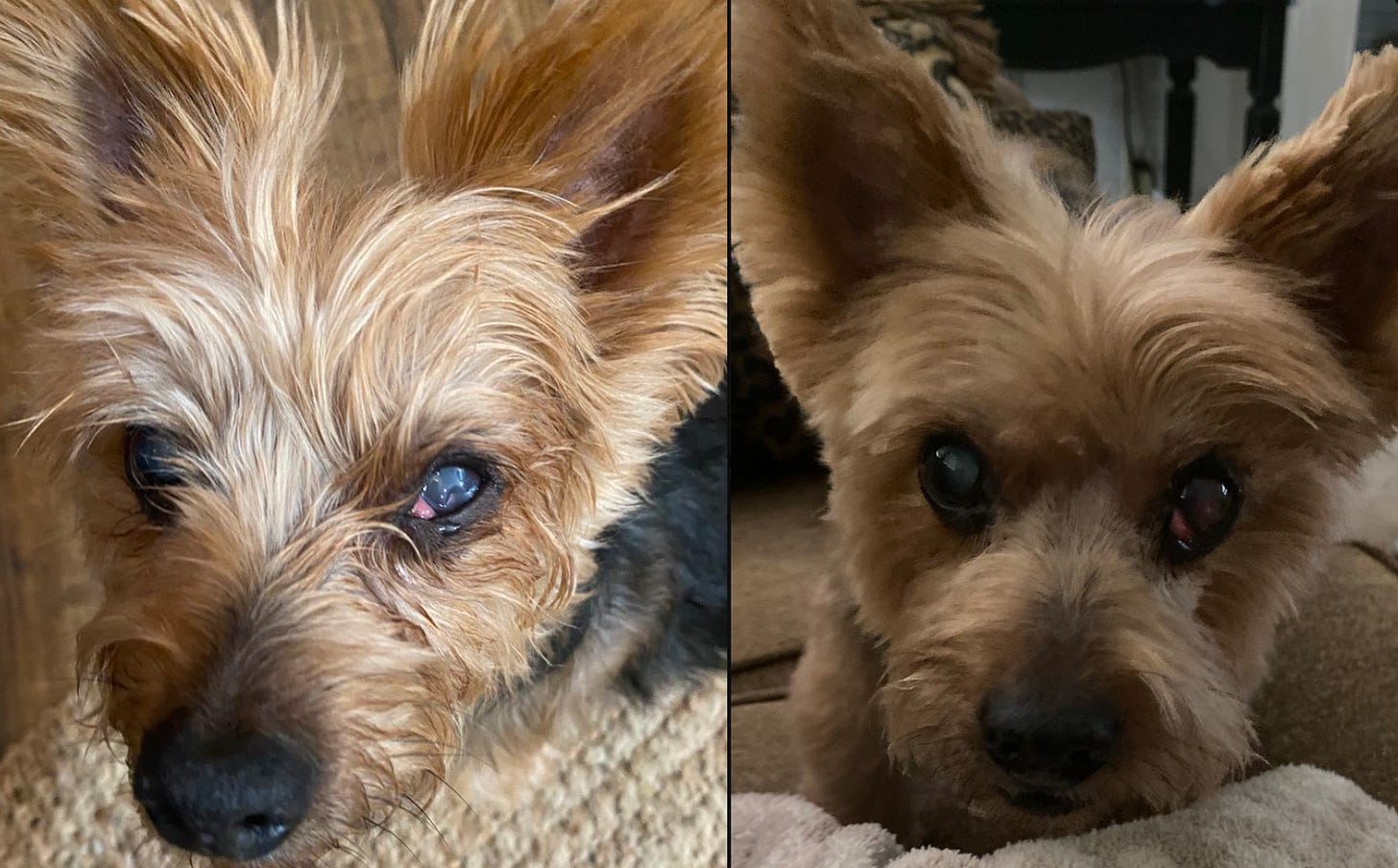 Je soigne actuellement mon Yorkshire Terrier pour une blessure à l'œil. Il est aveugle et son œil était en train de mourir. Je ne suis pas sûr de sa vision, mais son œil guérit. Première photo avant les gouttes de DMSO/huile de ricin. Deuxième photo après deux semaines d'utilisation des gouttes. On peut voir la baisse de pression de l'œil sur la première photo. La deuxième photo montre un œil presque parfaitement rond.