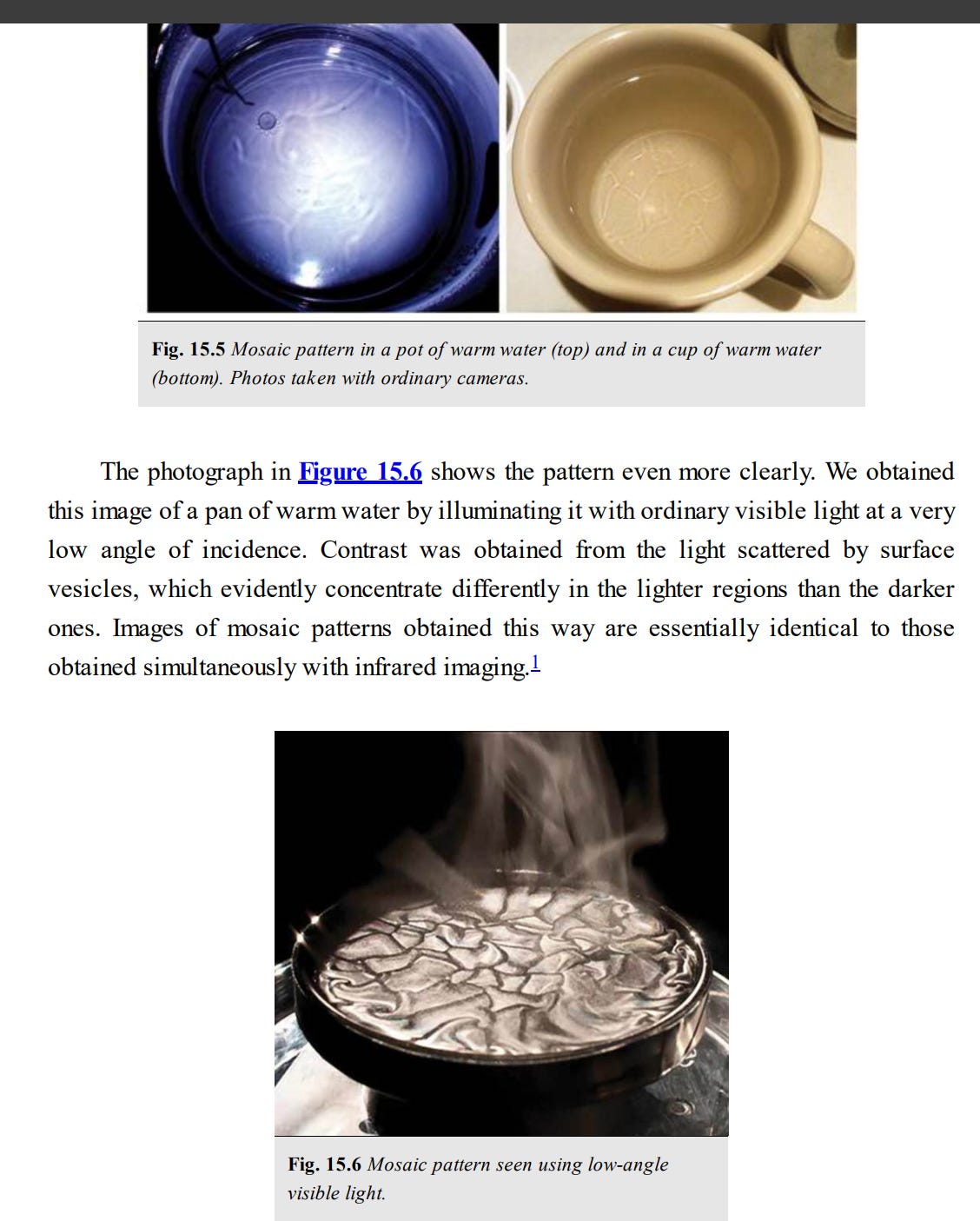 L'eau n'est pas uniforme ; elle présente une structure en mosaïque, composée de zones de transition plus structurées (zones EZ) et d'une masse d'eau plus diffuse contenant des charges positives, les ions hydronium. Ce phénomène est visible même sans équipement particulier. Ces motifs sont facilement observables dans les ombres ondulées projetées par l'eau d'une piscine. On peut également les observer dans un verre d'eau.