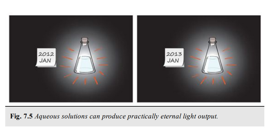 Voeikov remplit des récipients d'eau, auxquels il ajouta de faibles quantités de bicarbonate, de peroxyde et une petite quantité de luminol pour amplifier la lumière. Il scella ensuite les récipients et utilisa un photomultiplicateur pour examiner l'émission lumineuse au fil du temps. Les résultats furent inattendus. Après ce premier enregistrement, Voeikov rangea les récipients dans des placards sombres, ne les testant que de temps à autre. Après plus d'un an de conservation à l'obscurité, les mêmes flacons d'eau scellés continuèrent d'émettre de la lumière. L'intensité diminua légèrement, mais les flacons continuèrent d'émettre de la lumière pendant une durée incroyablement longue. La lumière refusait de s'éteindre (Fig. 7.5).