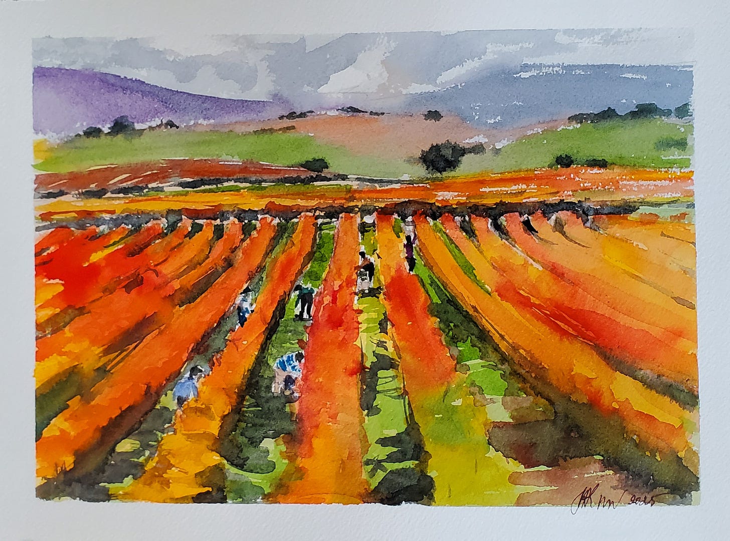 Œuvre du jour : Vignobles en rouge, aquarelle, 9x12 pouces .