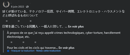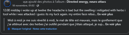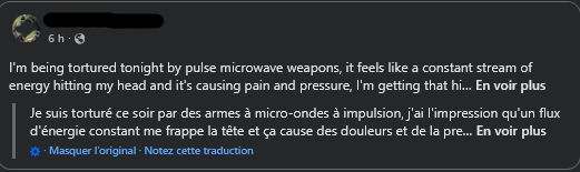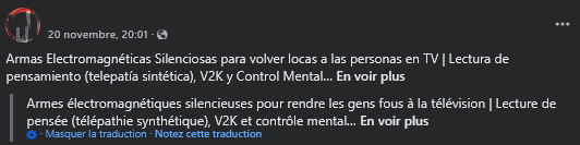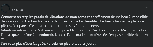Glaçant. Je pense aussi à Didier Verhille qui dénonçait cette criminalité dans les années 1995, nous la savons aujourd’hui interétatique et globalisée, pratiquée par les racailles en tout genre via des dispositifs tels que les téléphones. Je pense aussi à une connaissance , une infirmière en psychiatrie dans les années 1995 , le personnel se questionnait à propos des gens qui clamaient être agressés par des générateurs d'ondes en si disant et si ces gens là avaient raison... En professionnels aguerris, ils savaient faire la différence entre d'authentique malades et les internés abusifs.