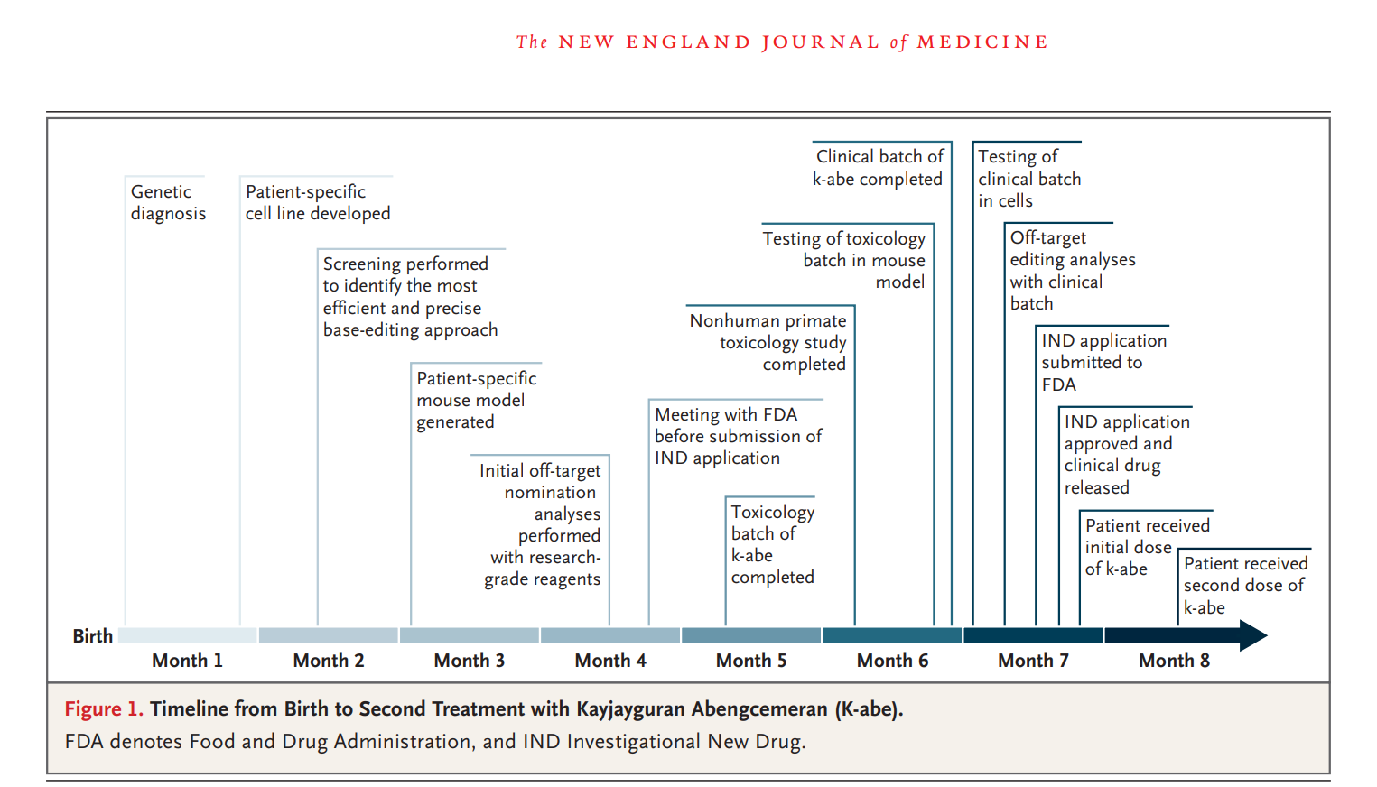 Endpoints News s'est entretenu avec Musunuru (auteur principal du projet de jus CRISPR k-[f]abe) et a publié l'entretien . Cette discussion a révélé « la clémence inattendue de la FDA, qui a quasiment éliminé l'obligation de mener des études animales dans le cadre du prochain essai clinique. Le principal souci n'est pas d'étudier l'innocuité et la toxicologie chez les animaux avant d'injecter de l'ARNm aux nouveau-nés, mais bien de garantir un essai clinique équitable.