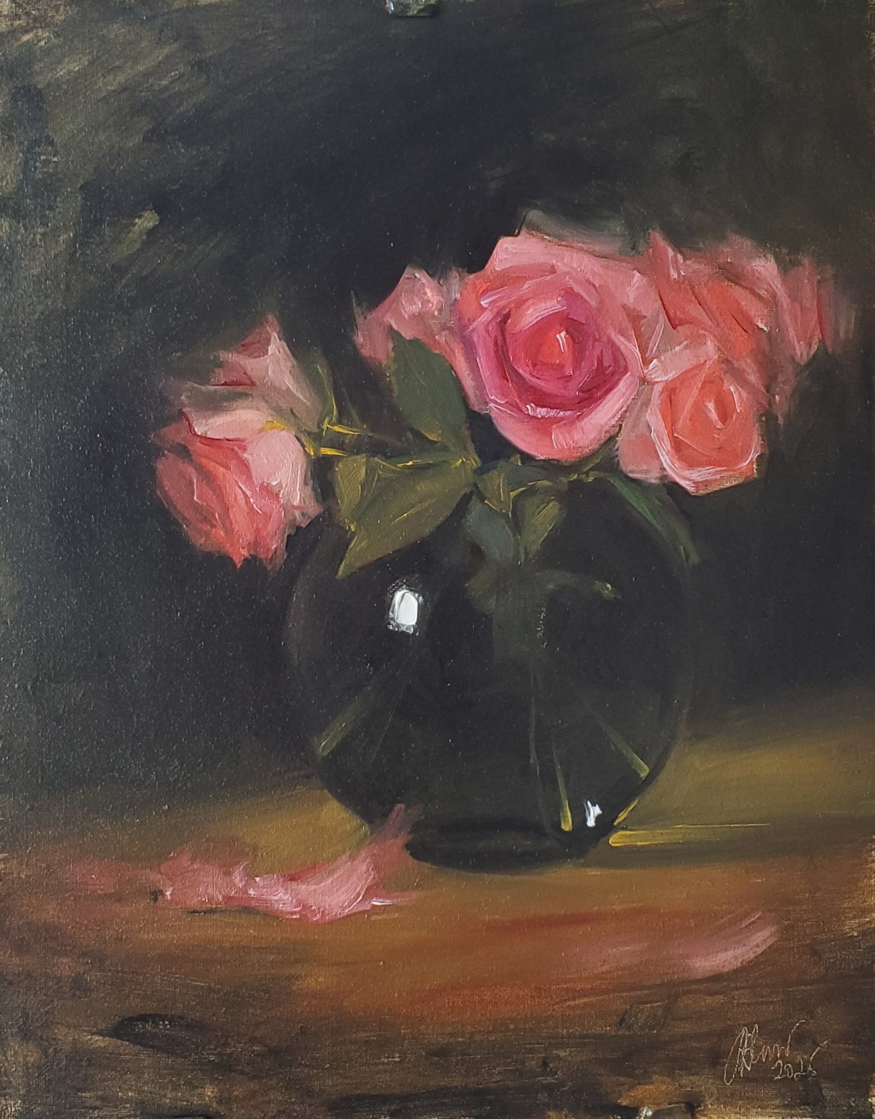 Œuvre d'art du jour : Roses roses, huile sur panneau, 11x14 pouces .