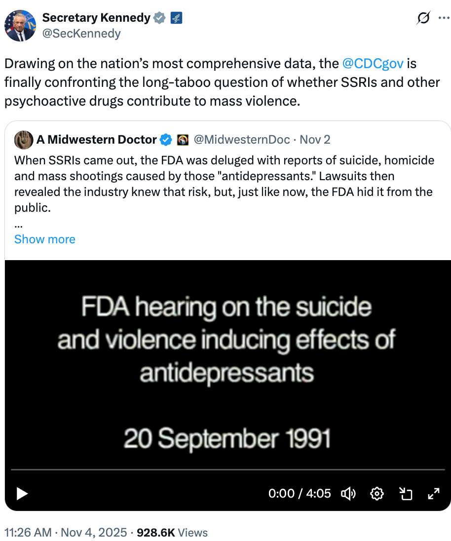 pas propres aux vaccins. Par exemple, le secrétaire Kennedy a récemment partagé une publication mettant en lumière les décennies de preuves dissimulées montrant que les ISRS peuvent provoquer des comportements violents.