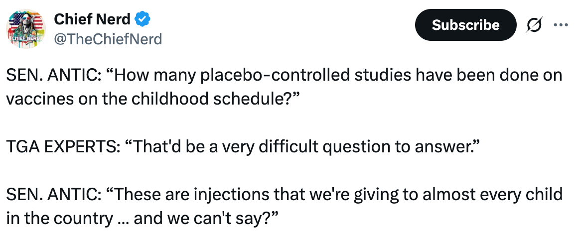 Si l'on considère les deux situations, il est évident que celle-ci est absurde, car un taux d'effets indésirables de 1 à 3 % serait probablement observé si un véritable placebo était utilisé, et tout taux supérieur (par exemple, 14 %) serait un dommage clairement imputable au vaccin. Or, c'est le statu quo qui prévaut depuis des décennies (et c'est pourquoi la communauté médicale a réagi de manière si hystérique à la décision de RFK Jr. d'exiger que les futurs vaccins soient testés par rapport à un placebo avant d'être approuvés ).
