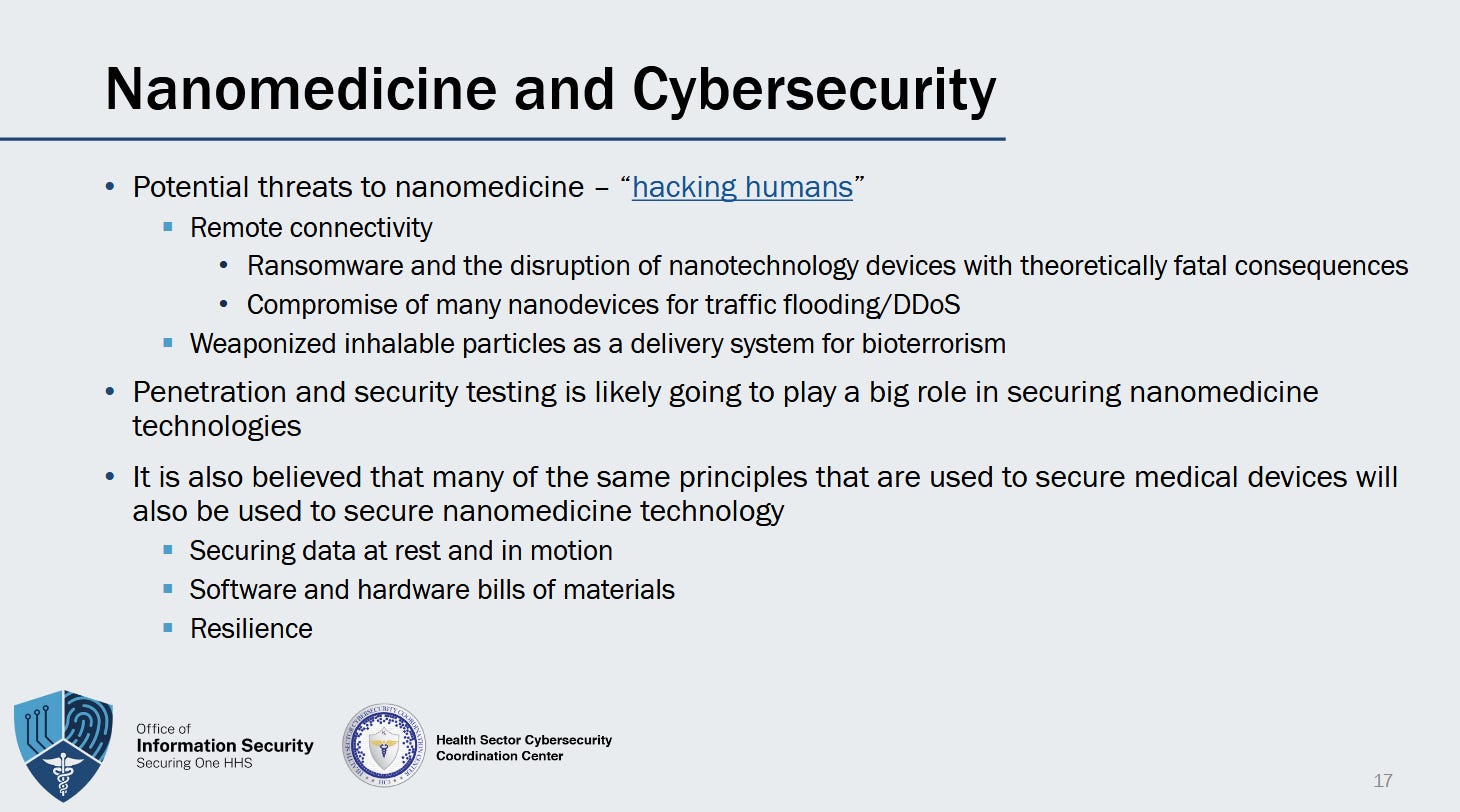 La quatrième révolution industrielle et technocratique déferle sur le secteur de la santé avec une force irrésistible, non sans risques dont le ministère de la Santé et des Services sociaux (HHS) est pleinement conscient. Je pense que ces risques sont largement sous-estimés, notamment en ce qui concerne les effets d'une IA incontrôlée sur la nanomédecine et la microrobotique, même si la vulnérabilité humaine au piratage est un fait établi. Comment un établissement de santé pourrait-il contrôler les éléments malveillants d'une IA, lorsqu'il a été démontré qu'une IA programmée pour découvrir de nouveaux médicaments peut identifier 40 000 nouvelles armes biologiques en seulement six heures ?