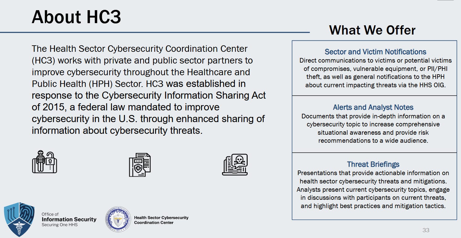 Le Centre de coordination de la cybersécurité du secteur de la santé (HC3) a été créé par le Département de la santé et des services sociaux pour aider à la protection des informations vitales et contrôlées liées aux soins de santé et pour garantir que le partage d'informations sur la cybersécurité soit coordonné dans l'ensemble du secteur de la santé et de la santé publique.