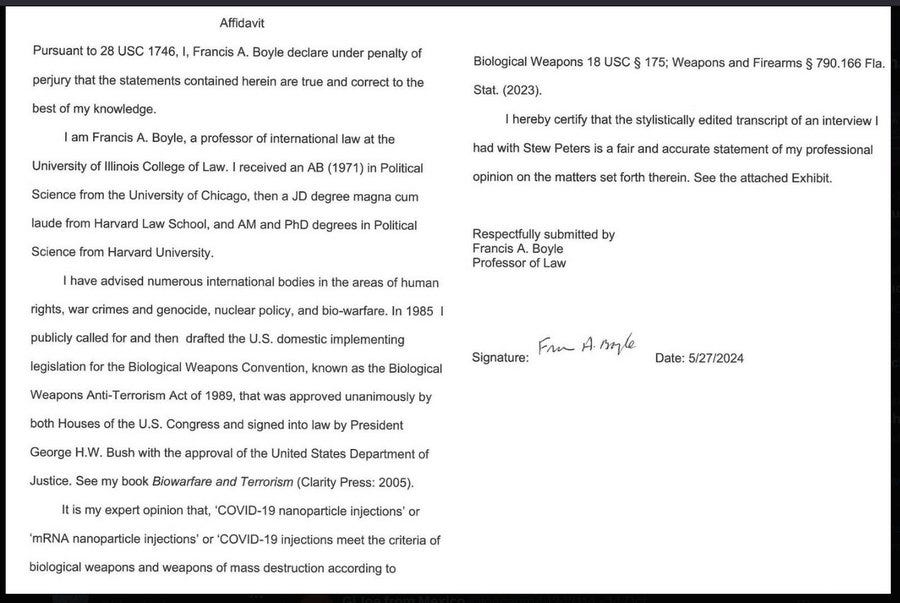 Déclaration sous serment du regretté professeur Francis Boyle :