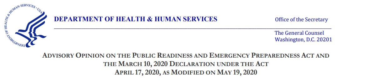 La même logique, le même montage financier, les mêmes lois illégales et les mêmes clauses d'exonération de responsabilité négociées au préalable via la loi PREP s'appliquent à tous les promoteurs de vaccins. Voici comment le HHS explique aux exécutants de ce cartel de la préparation aux pandémies qu'ils doivent suivre les ordres à la lettre pour se dégager de toute responsabilité :