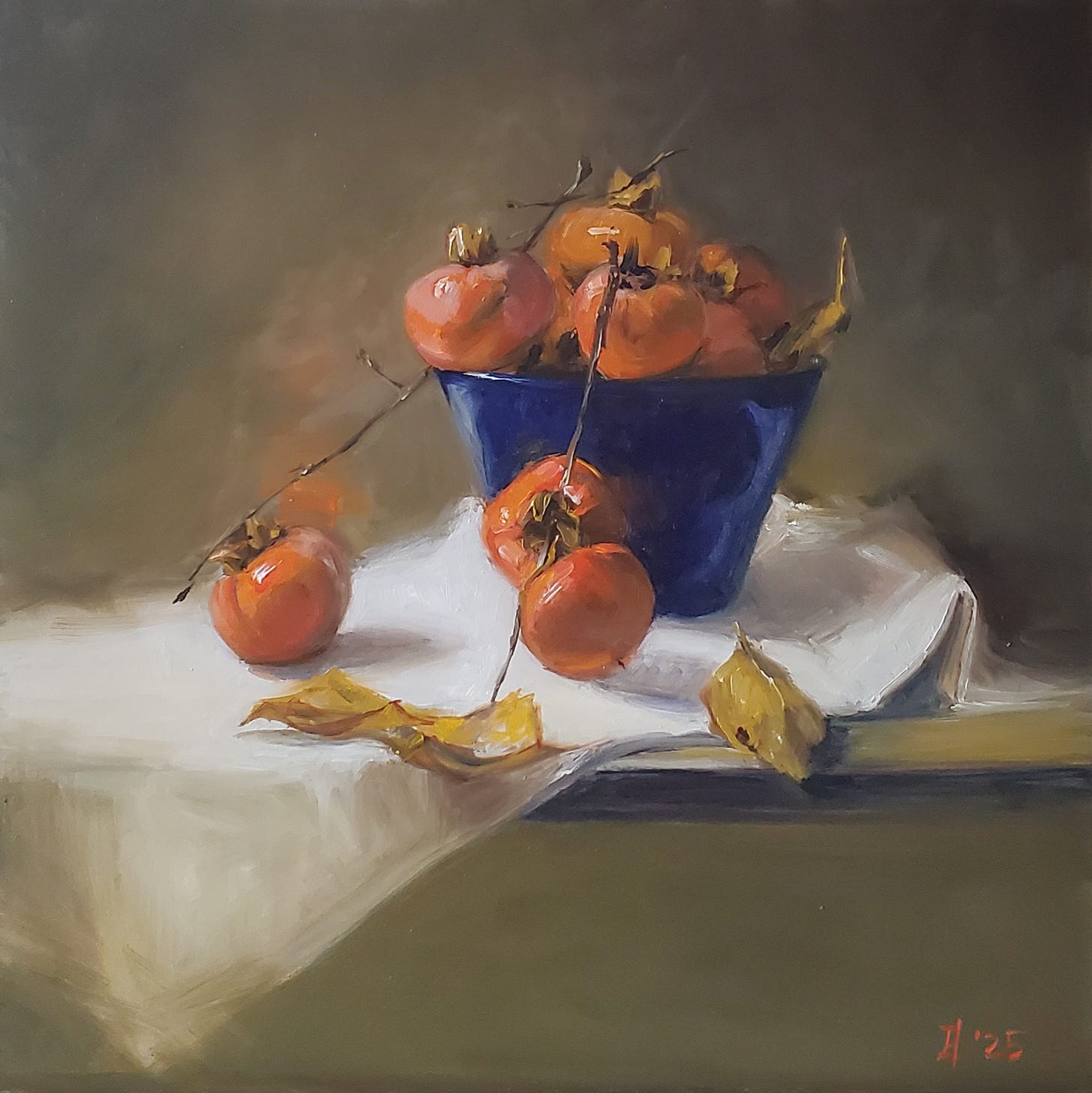 Œuvre d'art du jour : Kakis dans un bol bleu, huile sur panneau, 16x16 po .
