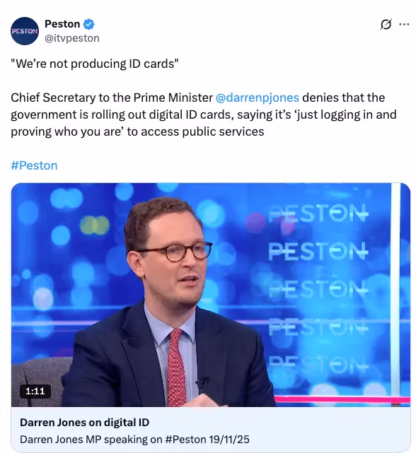 Dans une récente interview (19/11) , Darren Jones, secrétaire en chef du Premier ministre, a laissé entendre que l'identité numérique était entièrement facultative et visait simplement à rendre les services publics plus accessibles et plus pratiques. Or, il s'agit là d'un argumentaire plutôt fallacieux. D'une part, Starmer lui-même insiste sur le fait que l'identité numérique sera obligatoire pour travailler légalement au Royaume-Uni ; d'autre part, comme pour toute nouvelle technologie, une période de transition est nécessaire, mais le caractère facultatif de son utilisation ne devrait pas perdurer.