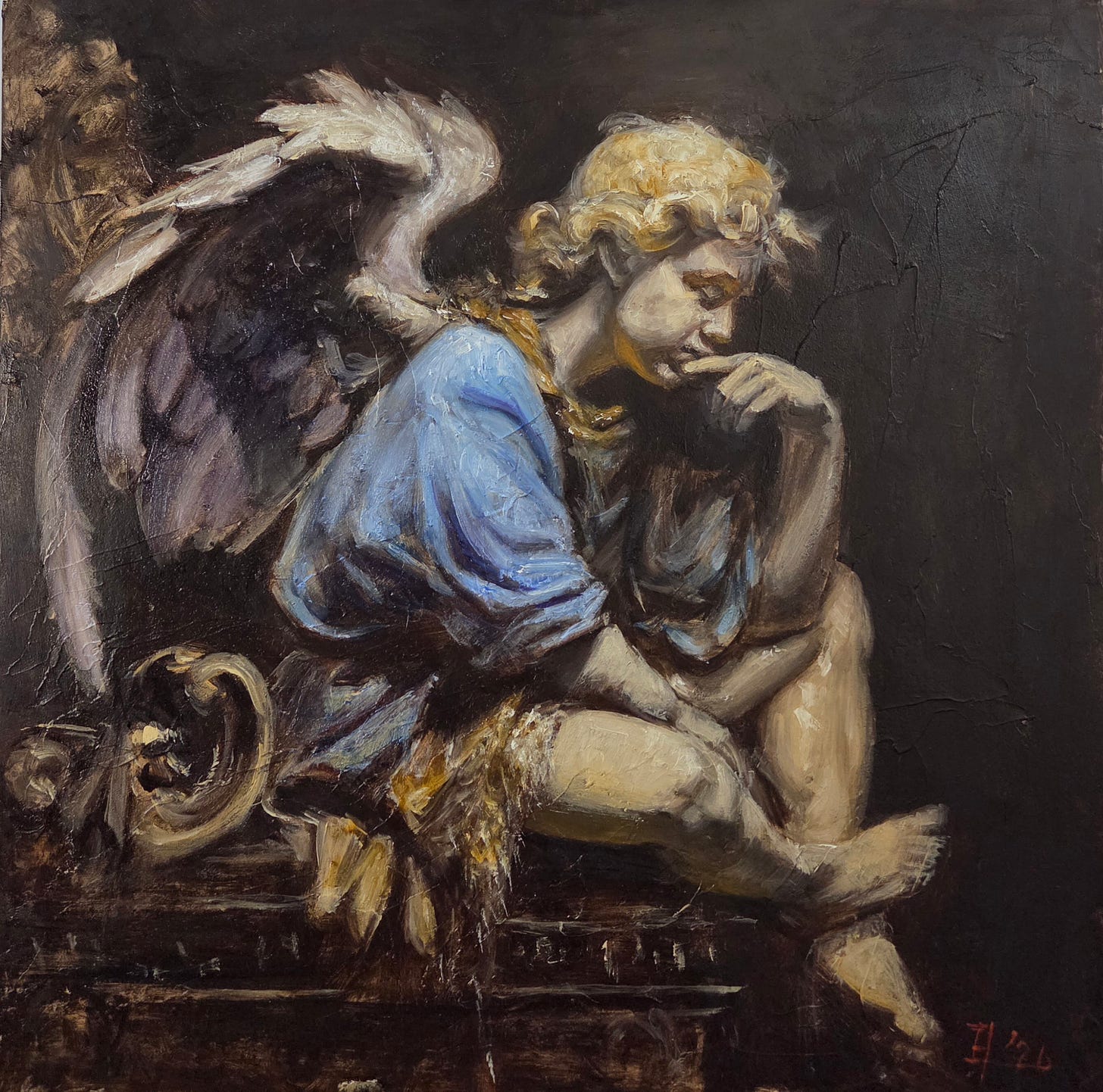 Œuvre d'art du jour : Ange pensif, huile sur panneau, 16x16 po .