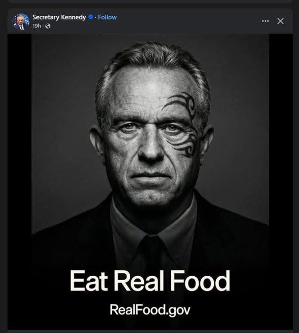 Je ne m'intéresse pas au football, et la seule fois où j'ai vraiment regardé les publicités du Super Bowl, c'était pour un devoir en école de commerce en 1997. À l'époque, elles étaient plutôt bien faites et professionnelles. Aujourd'hui, elles sont idiotes et vulgaires. La campagne « Real Food » de MAHA pour le Super Bowl 2026 s'inscrit parfaitement dans cette tendance, à la fois idiote et vulgaire. Je suis incapable d'expliquer cette esthétique noire et menaçante, le symbolisme satanique de l'œil unique, les tatouages faciaux (un signe distinctif des cartels de la drogue) et le choix, pour le moins surprenant, de Mike Tyson, ce brute épaisse et violente, comme égérie de cette campagne « santé ». Je ne suis pas en train de suggérer une théorie du complot. Je pose simplement des questions :