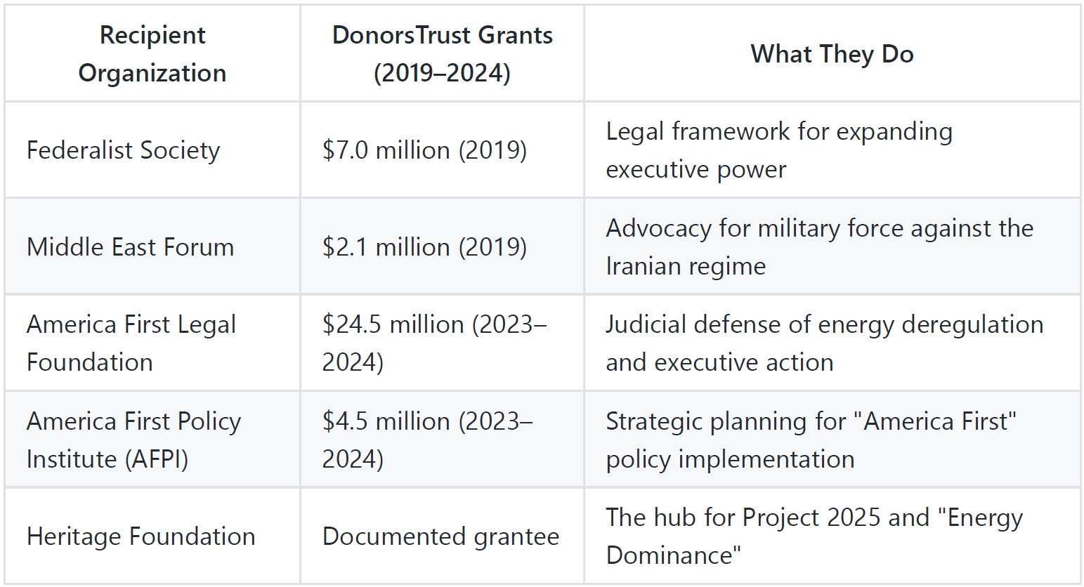 Et voici ce qui devrait vous interpeller : alors que les financements directs et traçables d’entreprises comme Exxon semblaient diminuer ces dernières années, les financements anonymes via Donors Trust ont explosé. L’argent n’a pas disparu ; il a simplement emprunté un autre chemin. Il semblerait que l’industrie des énergies fossiles continue de financer les fondements intellectuels d’une guerre qui éliminerait son principal concurrent au Moyen-Orient, tout en publiant des communiqués de presse vantant son engagement en faveur d’un avenir durable.