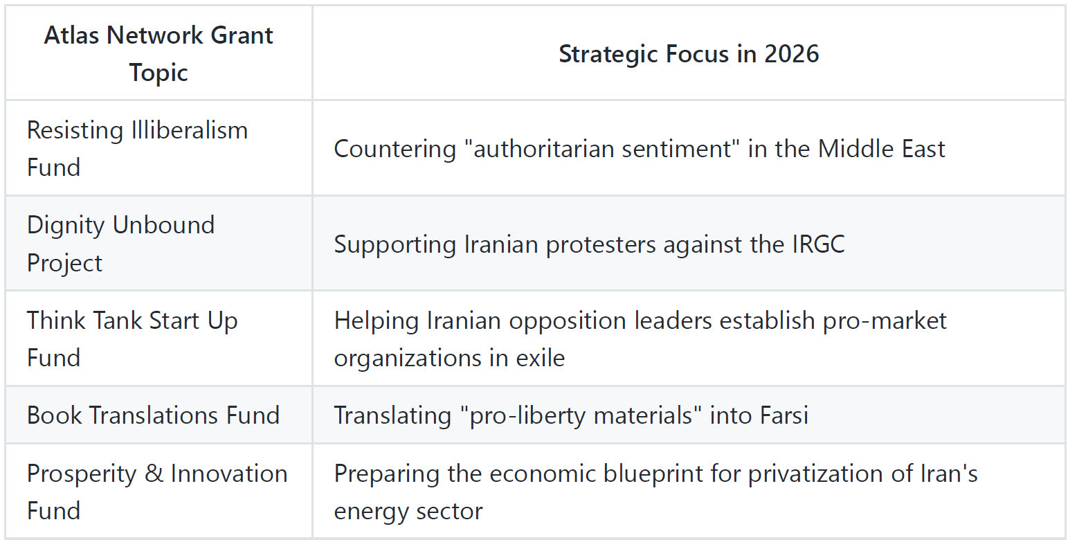 Le réseau Atlas fournit le récit moral et économique , présentant les frappes cinétiques comme une libération et préparant le terrain intellectuel pour un Iran post-régime, fondé sur le libre marché, dont le secteur énergétique sera ouvert aux mêmes entreprises qui ont financé l'architecture de la guerre.