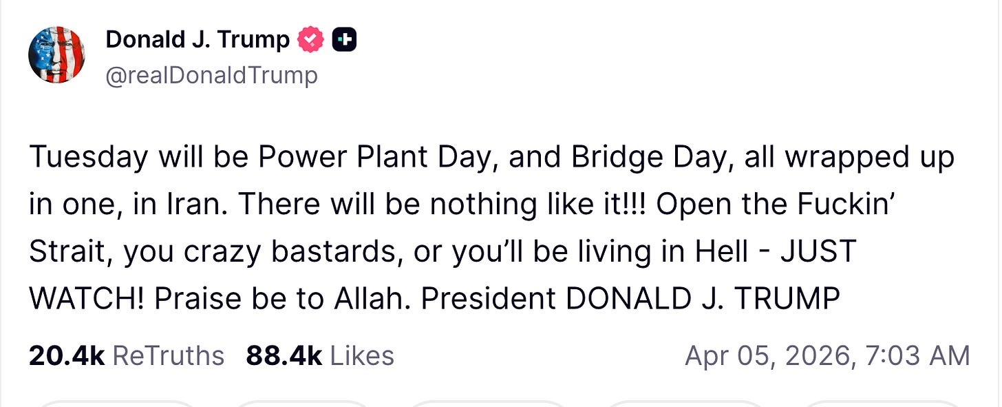 Cela s'est produit quelques heures avant l'ultimatum fixé par le président Donald Trump à Téhéran : rouvrir le détroit d'Ormuz, négocier un cessez-le-feu ou voir disparaître une « civilisation entière ». Et rien de tel pour faire preuve de « génie stable » que d'annoncer nonchalamment sur les réseaux sociaux son intention de commettre un génocide . Un simple mardi soir, l'extermination de 88 millions de personnes et de 5 000 ans d'histoire perse. Rien de bien méchant ! 🤯 Sérieusement, regardez donc sa publication catastrophique ci-dessous.
