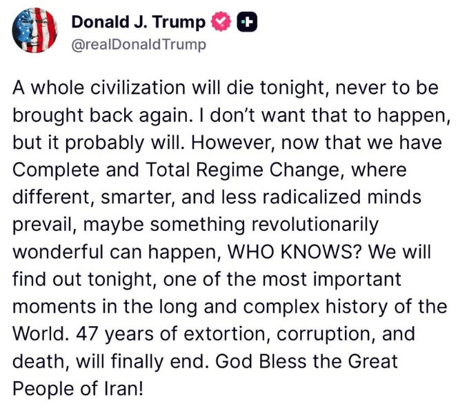 Le message de Trump sur les réseaux sociaux n'est pas un discours ferme. Ce n'est pas une négociation en position de force. Ce n'est pas une pression maximale. C'est un aveu public d'intention de commettre des crimes contre l'humanité.