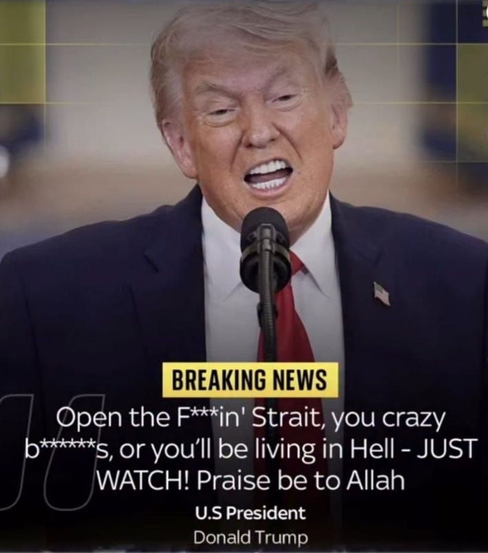 Ah oui, et on allait oublier – le coup de grâce – Trump conclut par : « Que Dieu bénisse le grand peuple iranien ! » Parce que rien ne dit « Que Dieu vous bénisse » comme la vaporisation d'une civilisation entière. 🙏 « On vous aime tellement qu'on va tous vous tuer ! Pensées et prières ! »